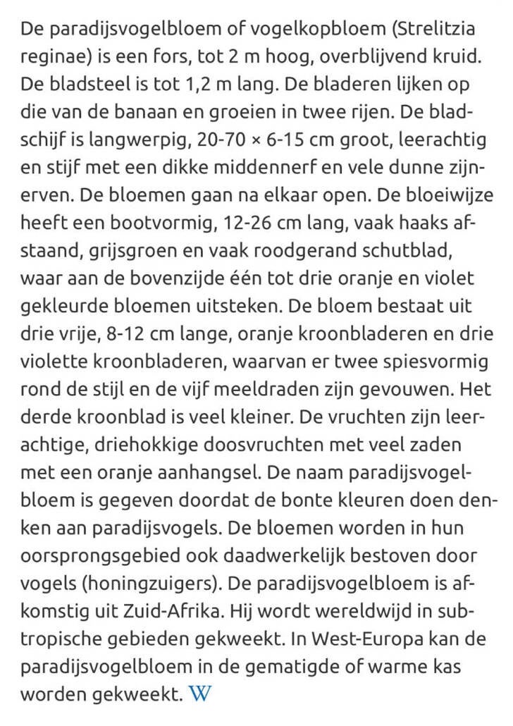 Deze strelitzia is de Strelizia Reginae. De plant wordt niet zo hoog als de Strelitzia Nicolai en de bloem heeft meer kroonbladeren ( gele en violette) zie beschrijving hiernaast.