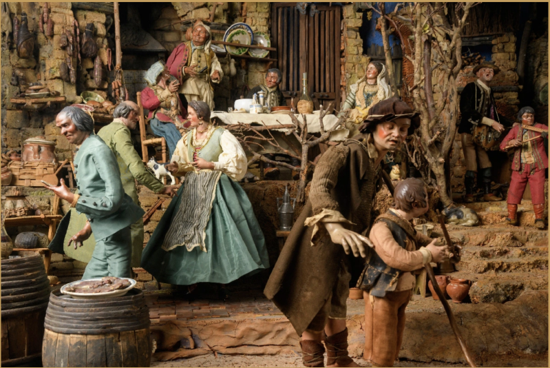 Belangrijke figuren zijn onder andere de kaartspelers, die rond een vat zijn opgesteld; deze stukken van Francesco Celebrano behoorden ooit toe aan Karel III.