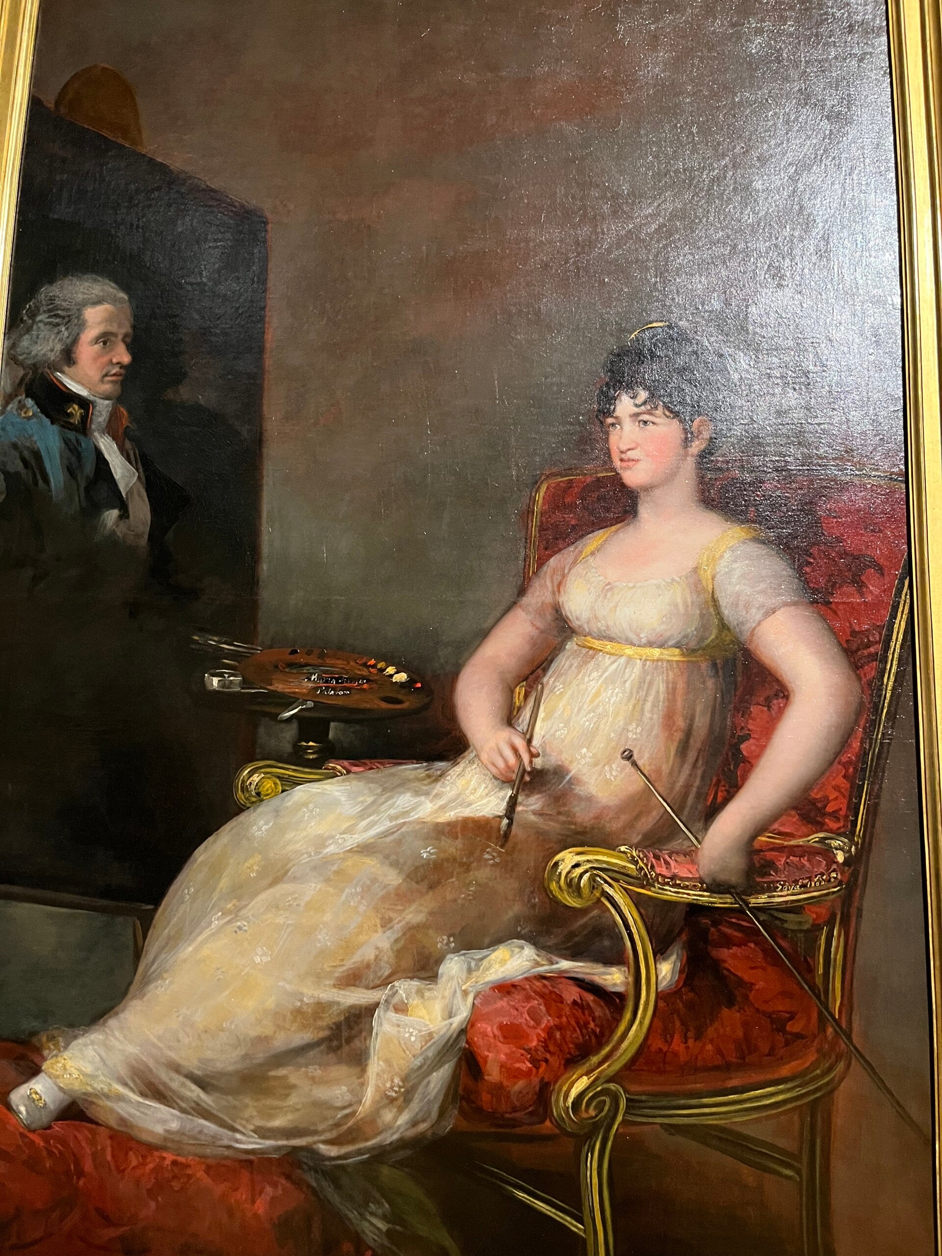 Het schilderij toont Maria Tomasa de Palafox y Portocarrero, markiezin van Villefrance, zittend in een rode fluwelen fauteuil in een empire-jurk. Ze schildert een portret van haar man, Francisco de Borjan Alvarez de Toledo y Gonzaga, de XI markies van Villefrance. De markiezin, een kunstzinnige amateur-schilder, was academica van verdiensten aan de Koninklijke Academie voor Schone Kunsten van San Fernando.