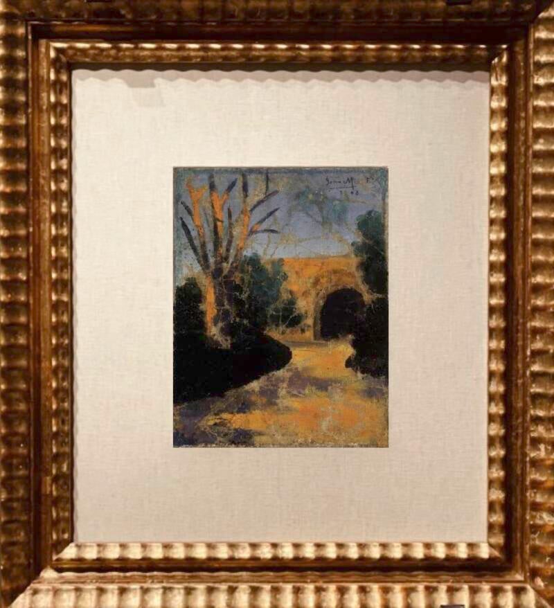 Links het eerste landschapsschilderij uit 1908 dat zijn interesse voor het omliggende platteland en details van de natuur laat zien, rechts een schilderij op de achterkant van het schilderij links;