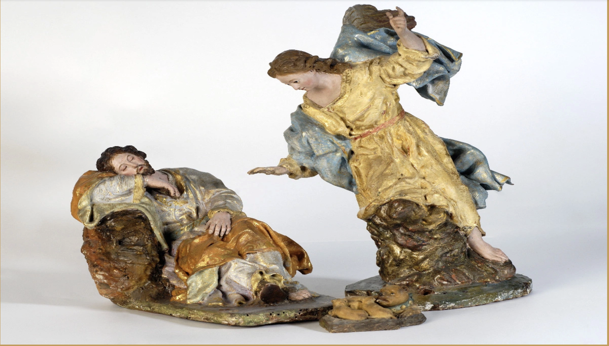 Deze is geplaatst op een rol, wat suggereert dat het een voorbereidend model was voor een tabernakelbeeld.