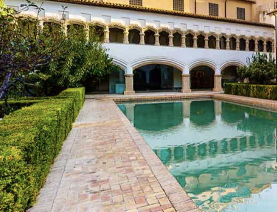 Het kristalheldere water van het zwembad voert ons terug in de tijd, weerspiegelt de architectuur als een spiegel en benadrukt de monumentaliteit ervan.